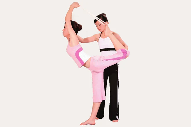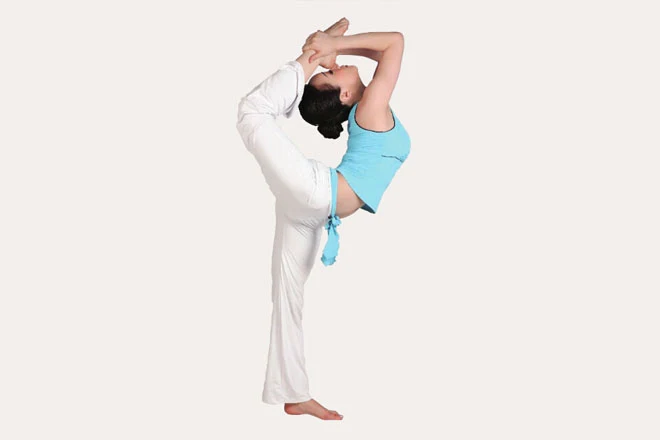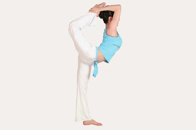 體式介紹:與舞王式一樣,這個體式也是獻給舞蹈之神濕婆的。它在舞王式的基礎上再加上了一個頭部後仰、用腳跟觸鼻尖的動作。