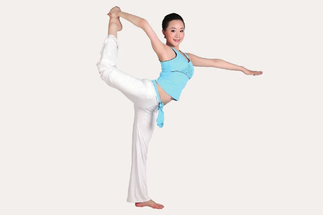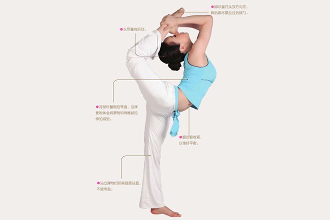 這個挑戰極限的動作非常有難度,它比舞王式更考驗平衡能力和柔韌性,在練習時盡力而為就好,不要因強迫自己完成標準動作而造成不必要的肌肉拉傷。