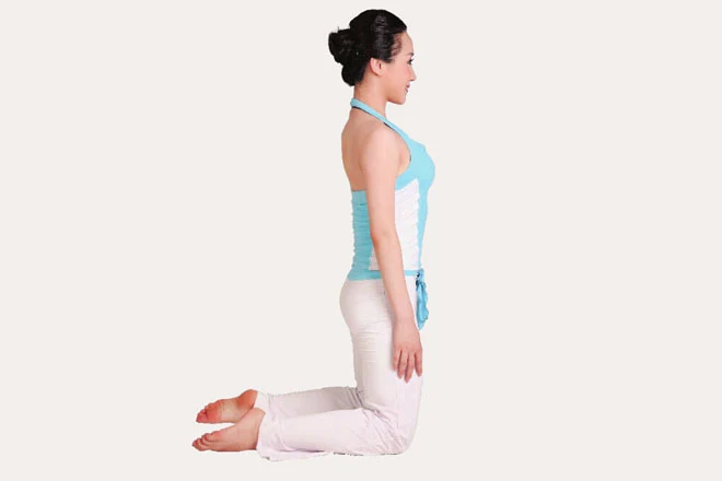 1、跪立,吸氣,雙腿分開與肩同寬,雙臂自然垂於體側,腰背挺直,目視前方。