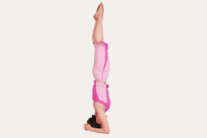2、頭頂著地,雙腳離地,慢慢向上伸直雙腿,膝蓋繃直,保持身體平衡。