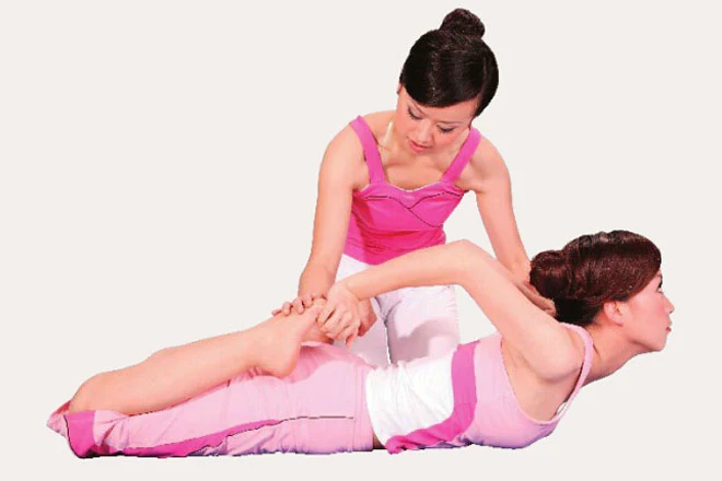 練習時,雙手要用力將雙腳壓向臀部兩側的地面。如果你無法做的很好,可以讓教練來幫你按壓雙腿。此外,教練還會用雙手輔助你的肩部,以防止你下壓雙腿時胸部過分抬起