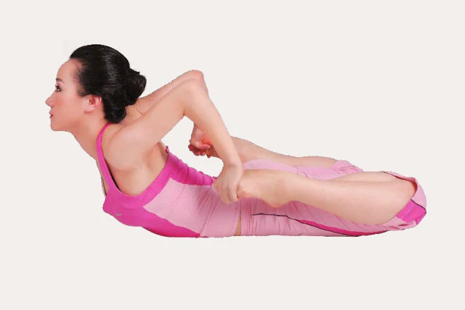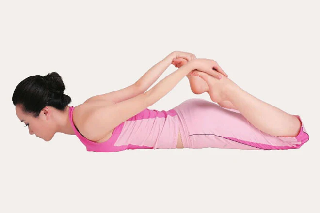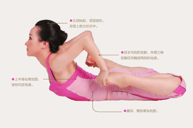 2、屈雙膝,腳尖指向臀部方向。上身向上抬,屈肘,呼氣,雙手向後抓住腳背,並盡量將雙腳壓向臀部外側的地面。