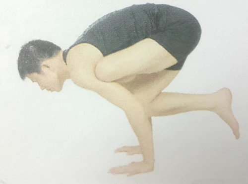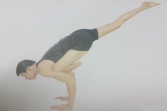 3、左膝緊緊抵住左腋窩,呼氣,屈肘,上臂與地面平行,前臂與地面垂直,身體重心前移,吸氣,右腿向後上揚,膝蓋繃直,右腿完全伸展。伸展頸部,盡可能將頭抬高。保持這個體式幾秒鐘,正常地呼吸。