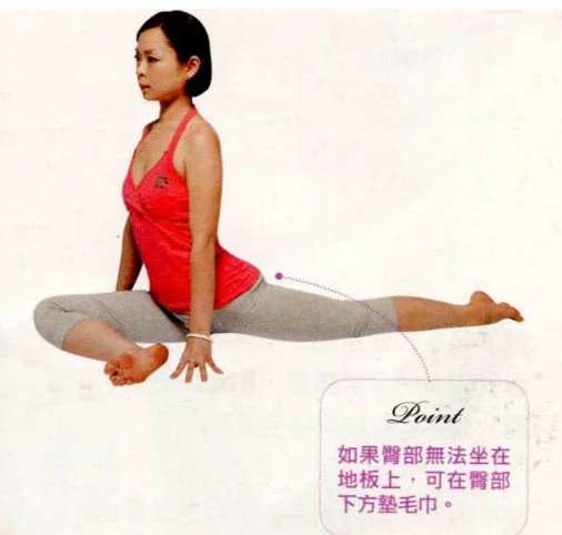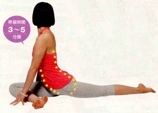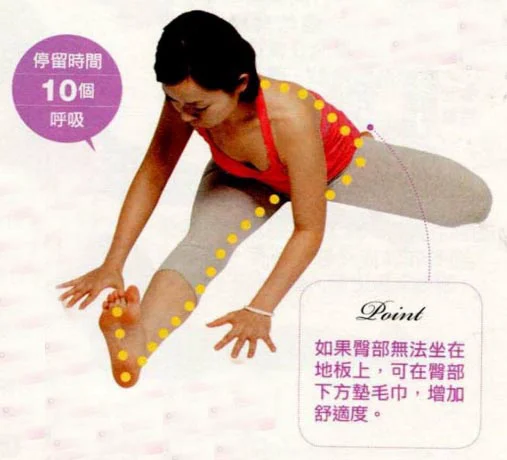 吸氣,脊椎拉長,吐氣身體往後方移動,手可以移到右腳的外側,停留3-5分鐘後,緩慢還原換腳。