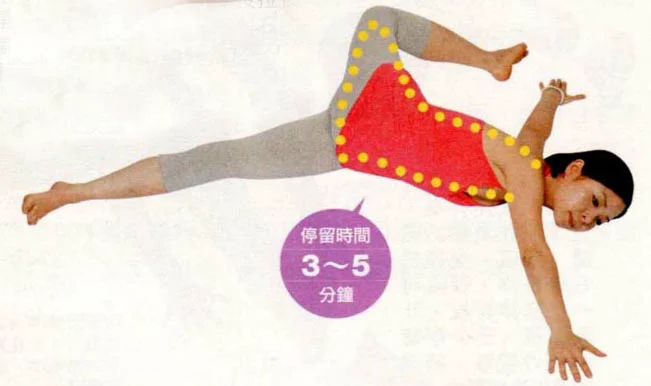 吸氣,延伸脊椎,雙手放在右腳的兩邊,吐氣,身體往後扭轉,吸氣再一次延伸脊椎,吐氣停留,至少停留10個動作,緩慢還原後換腳動作。