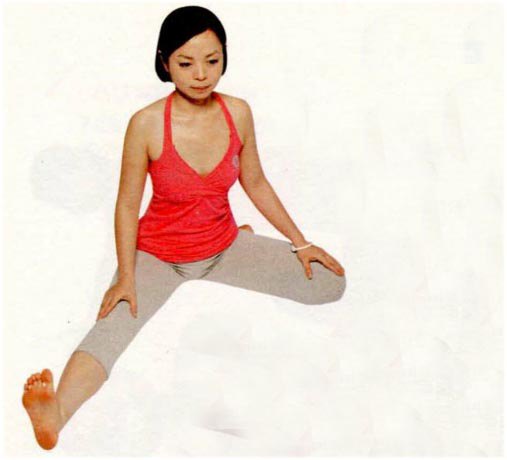 左腳向俊滑放在大腿後側,和右腳呈90度姿勢使骨盆放正。