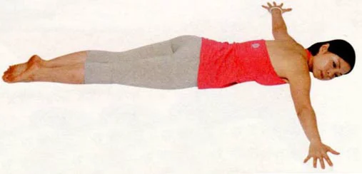 趴姿,右腳彎曲往後拉長,心往下,左邊的肩膀往後轉開右腳彎曲往後拉長,以髖關節為起始點,將右腿向後方拉長,右手往前方延伸,保持平順呼吸,停留3-5分鐘後,慢慢恢復換腳進行練習。