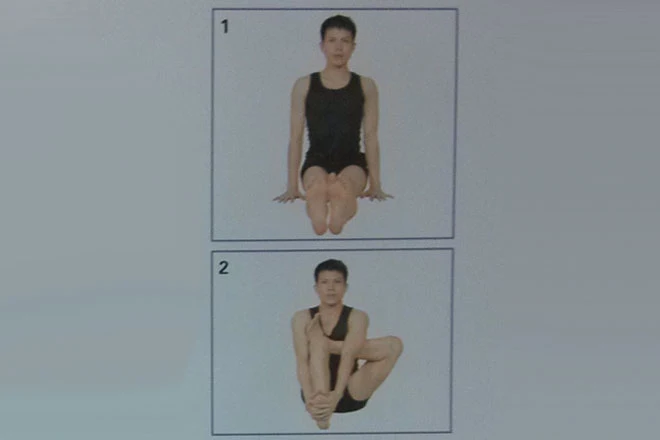 2、屈右膝,膝蓋朝上,腳跟落地,腳掌朝外;屈左膝,外展,將左腳放在右大腿上,左小腿脛骨與地面水平。雙臂向前伸展,雙手環握住右腳腳弓。左小腿脛骨位於左腋窩下方。