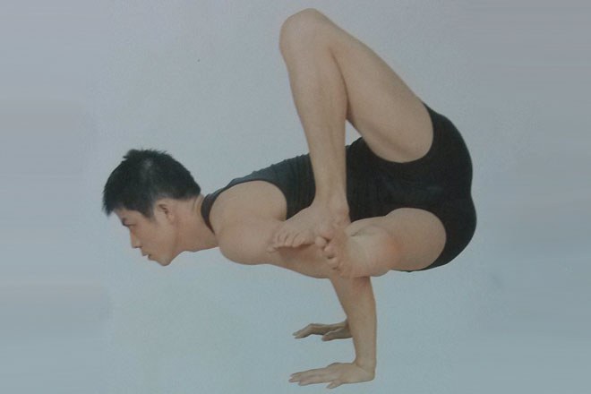 3、呼氣,軀幹和頭部向右側扭轉90度,脊柱向上伸展;右臂自然放於軀幹右側,左臂越過右腿和左腿,與左小腿外側緊貼,同時左腳僅僅抵住左腋窩。