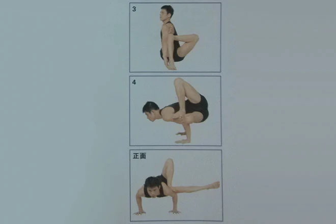 4、軀幹和頭部前傾,同時彎曲雙肘,十指張開,雙掌用力撐地,吸氣,抬起臀部,直至軀幹與地面水平。左膝朝上,左小腿脛骨與地面垂直,左腳掌落在左上臂外側;右腿向軀幹左側伸展,右膝繃直。身體重量完全放在雙臂和雙手上,保持身體平衡。伸展脊柱和頸部,保持頭部抬起。保持這個體式30秒鐘,深長地呼吸。