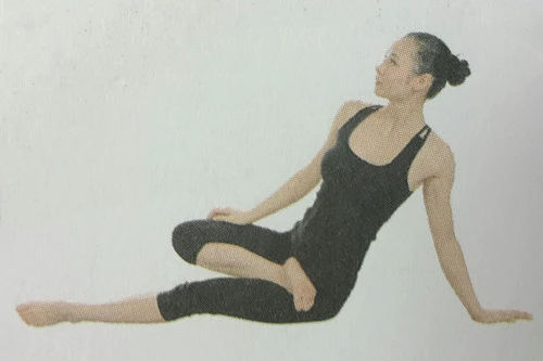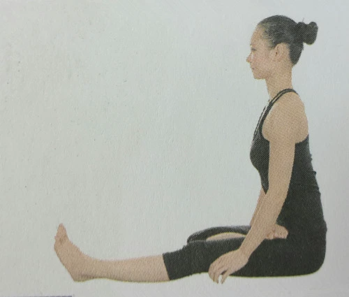 1、以手杖式坐立。彎曲右膝,右腳放在左大腿根部,右腳腳跟抵住臍部中心,右腿呈半蓮花式;左腿保持繃直。