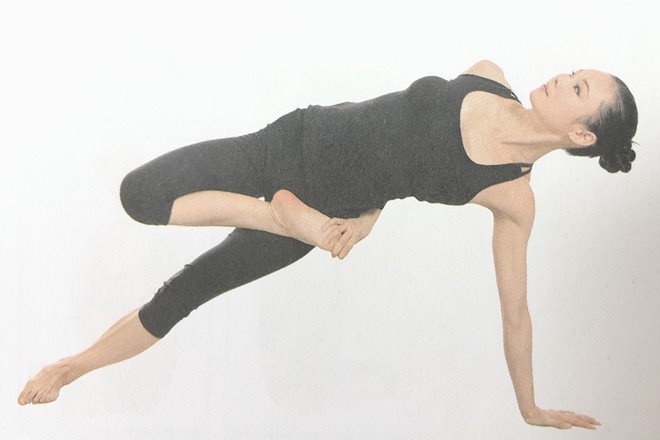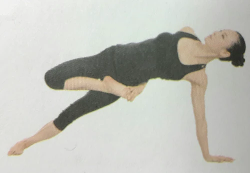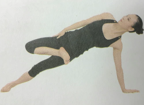 2、左臂向體後伸直,左手撐地;抬起右臀,右腿抬離地面,整個身子向左傾斜。左臀、左小腿外側及左腳外側都貼在地面上。