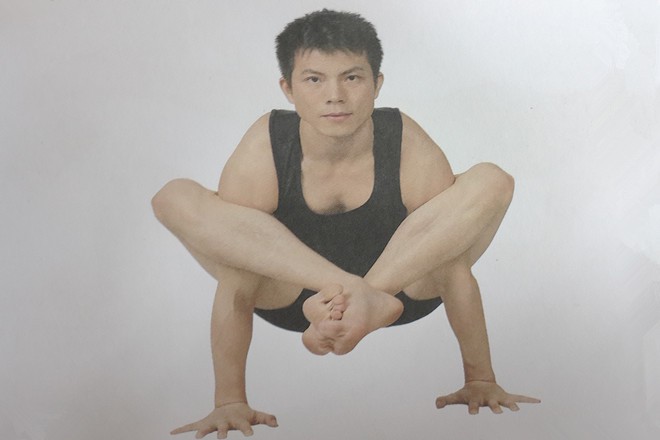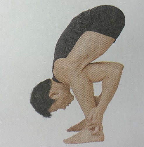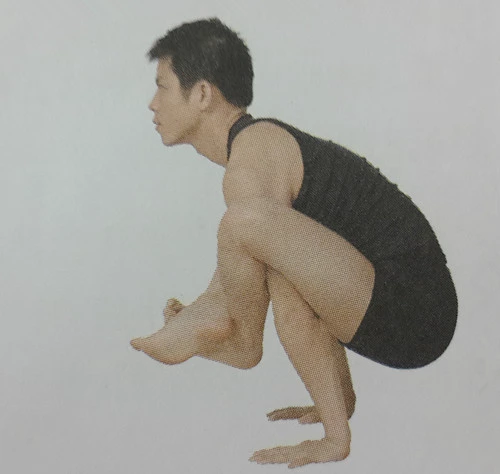 2、抬升臀部,軀幹前傾,向下移動雙臂並從雙腿內側向後伸展,屈手肘,雙手分別握住外側腳踝,雙膝彎曲,膝窩緊緊夾住上臂。