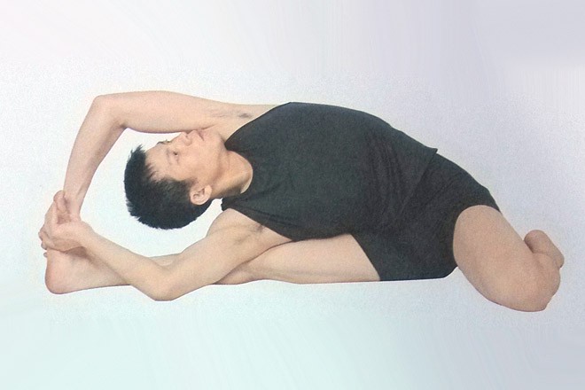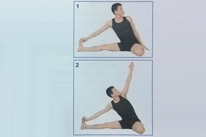 1、以手杖式坐在地面上,腿部向前伸直。彎曲左膝,向左側移動,左小腿前部緊貼地面,大腿壓在小腿上。盡可能地將左膝向外伸展,使兩腿成鈍角。左手放於左腳邊,指尖觸地,右臂伸直,右手大拇指、食指和中指緩緩抓住右腳大腳趾。軀幹和頭部向左側扭轉,保持脊柱伸展,雙眼視線看向左側。