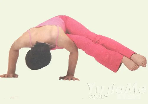 3、頸部向前伸展,眼睛看前方。保持一段時間。稍屈膝,頭頂再次觸地,回到頭倒立變化式一。換另一側身體練習。