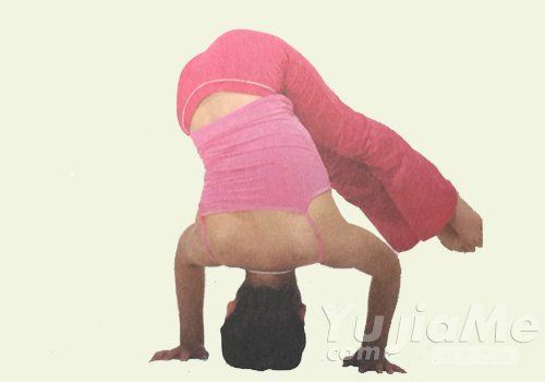 1、完成頭倒立變化式一。緩慢地放低雙腿,在與地面平行以後,軀幹向左扭轉。