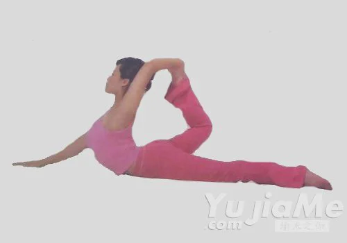 3、左腿膝關節伸展向上抬高,右手從內測抓住左膝關節內側,整個身體以腹部觸地,保持平穩。一段時間後,換身體另一側練習。
