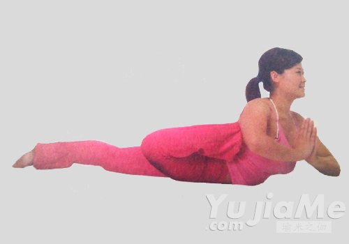 身體自腰後屈,小腹不要離開地板,腳可以夾在腋下。