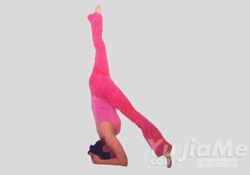 完成頭倒立式。屈右髖,放低右腿,右腳落在身體前側的地面上,左腿保持向上的伸展,骨盆放正,不出現身體側傾,保持一段時間,回到頭倒立第一式,之後換另一側身體練習。