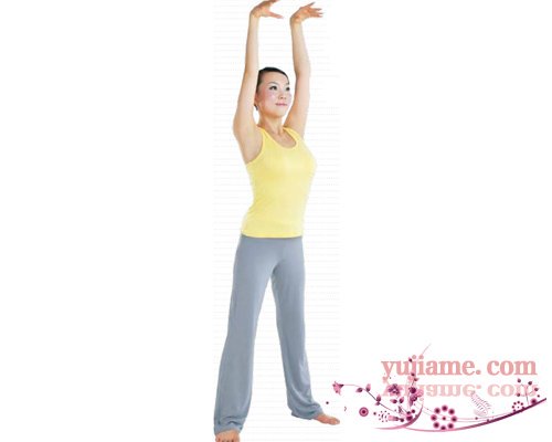 站立在墊子上,兩腳分開稍微比肩寬。兩臂向上伸直,放鬆手腕,兩手手指自然向下垂。