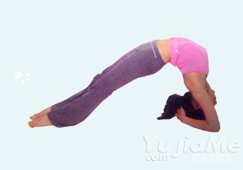 2、雙腳向頭部方向靠近。鬆開雙手,手掌觸地,小臂不離地。頭頂離開地面,向腳得方向看,雙手握住腳踝。整個脊柱充分前推,軀幹向上拱起。保持一段時間後,頭頂落地,回到頭倒立第一式,還原放鬆。