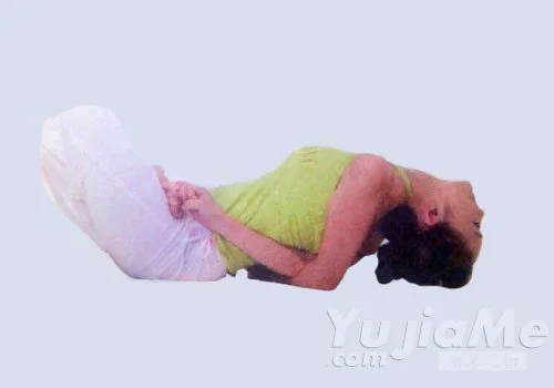 3、呼氣,抬膝,大腿離開地面,然後身體後仰到地面。保持2次呼吸。向後伸展頸部,把頭頂抵在地面上,胸部和軀幹向上拱起,保持幾秒鐘。