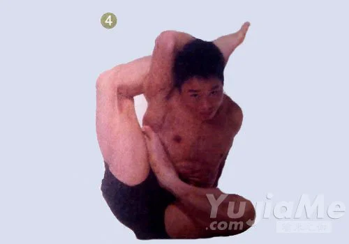 4、頭和頸部抬起,後背挺直,做手放開右腳腳踝。右臂垂直向上抬起,彎曲右肘向後,將越過頸後的右腿放在頸後,放低左臂,肘部彎曲,向上抬左前臂直到左手與兩肩胛骨持平,然後雙手在背後相握。保持這個體式數秒,正常地呼吸,在身體另一側重複這個體式,保持同樣的時間。