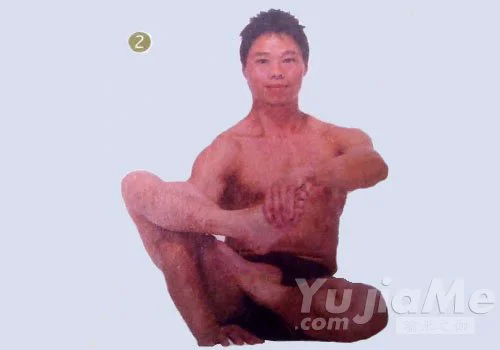 2、彎曲右膝,把右腳拉近軀幹,用左手抓住右腳腳掌。