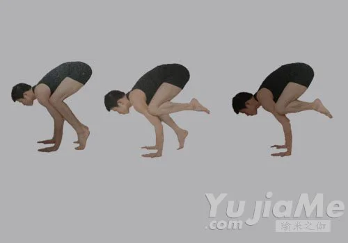2、呼氣,臉朝下,軀幹前傾,踮起腳尖,腳掌和腳跟離地,逐步將軀幹向上抬起,帶動臀部和雙腿向上,將身體重量放在雙手上,吸氣,依次抬起左、右腳。雙肘略彎,膝蓋緊緊抵住上臂後側,大腿緊貼腹部,小腿後部緊貼大腿後部,雙腿併攏。保持身體平衡,完成依次深長呼吸。