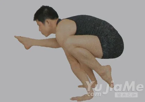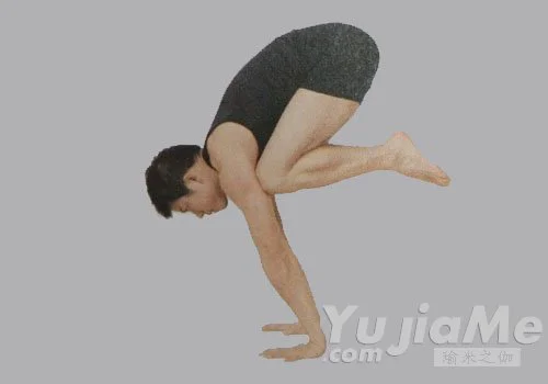 2、吸氣,臉朝下,軀幹前屈,踮起腳尖,腳掌和腳跟離地,逐步將軀幹向上抬起,帶動臀部和雙腿向上,同時雙掌用力撐地,雙肘繃緊,雙臂伸直,與地面保持垂直;雙膝彎曲,膝蓋緊緊抵在腋窩下。吸氣再呼氣,抬起左腳,腳尖離地,腳背朝下,左膝蓋緊緊抵住左腋;雙臂用力撐地,保持身體平衡,完成一次深長的呼吸。繼續吸氣抬起右腳,腳尖離地,腳背朝下,右膝蓋緊緊抵住右腋,雙腳併攏,小腿盡力向大腿貼近;身體重量完全放在雙臂和雙掌上,用力支撐身體平衡。