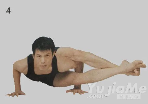 4、呼氣,彎曲雙肘,使上臂與前臂垂直,雙掌緊壓地面,身體重量完全放在雙掌上,保持身體平衡;雙腿向左側伸展,保持雙腳交叉,左臂置於雙腿之間,軀幹前傾,與地面保持平行。盡可能低保持這個體式,正常地呼吸。