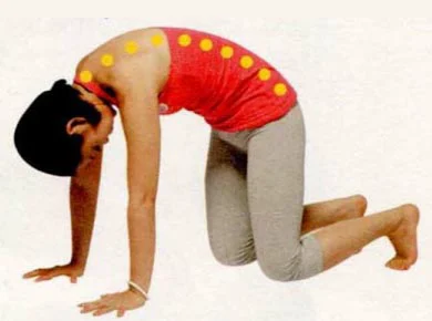 深深的吐氣,感受你肚子用力的往內縮,頭部及臀部也往內縮,上背拱起,肩膀遠離耳朵,動作重複8次。