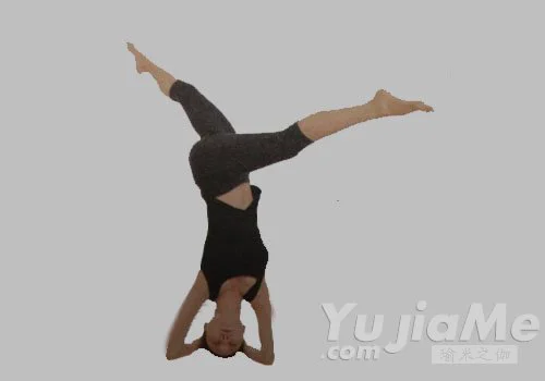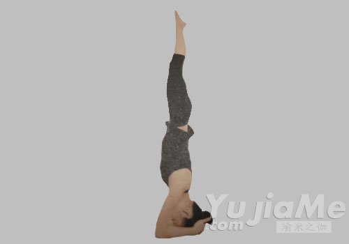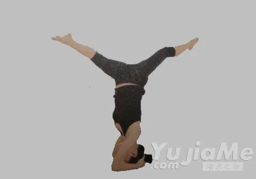 3、呼氣,回到頭倒立第一式。然後右腿朝前,左腿朝後,朝左側扭轉脊柱,重複這個體式。