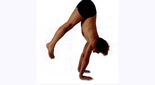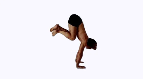雙手下壓並跳起,就如跳過一個障礙物,雙腳合攏。份部移動的軌跡是向上的弧形。這樣把重心完全轉移到手上,以手腕為軸心把頭,肩膀,上背盡量轉到前方。現在身體是平衡的,不要向上或向下移動。眼晴注視雙手前面的凝視點,用雙手和收束防止著地。
