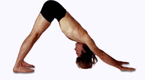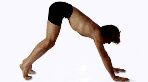 進人下犬式並注視著肚臍凝視點。意識集中於會陰收束和收腹收束。不要拉緊下腹—這會抑制下一次吸氣的長度和上提效果。雙腳平行並和艘部同寬。雙手與肩同寬。手指張開,中指朝前。避免肩膀下塌。因為這會限制呼吸並縮小進人下一個姿勢所需要的肩部伸展度。