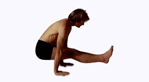 運用收束進一步呼氣,抬頭,把凝視點從肚臍轉移到兩手之間的一點,然後繼續向前移到雙手前方30公分(12英寸)處。肩膀伸展並朝前移,膝蓋彎曲並用腳趾立起來。向後擺,準備躍起。現在開始下一次吸氣。