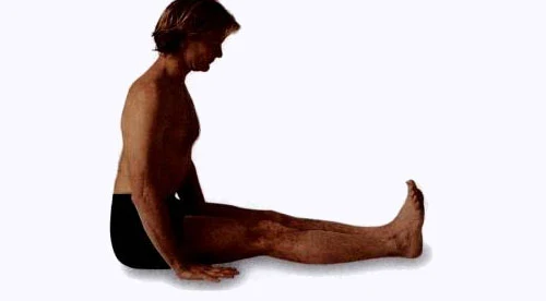 慢慢地以棍杖式把臂部放在墊子上,保持雙手下壓直到呼氣結束。現在視線收回凝視點,把它轉移到鼻尖。水平高的學生可以嘗試在一次長吸氣中跳人下一個體位(asana)的位置。