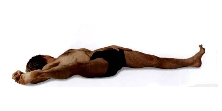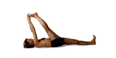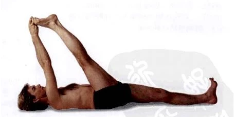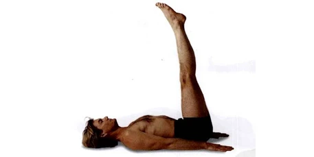 呼氣,右腿往下放低至墊子上並還原到步驟2中躺著的體位。從這一點(步驟2)開始,左腿重複下面的步驟,左右方向互換。