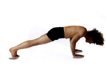 從下犬式開始,吸氣,腿跳起穿過手臂至棍杖式。呼氣躺下,檢查脊推是否成一條直線。