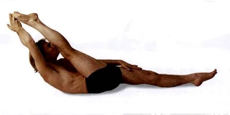 呼氣,左腿用力往下推,好像以它站立著一樣,背部抬高並完全離開墊子。右腿以上腹的力量結合收束上提,直至下巴貼住脛骨。利用右腿和右臂之間反向的能且使背部離開墊子,注視腳凝視點。完全深呼吸五次。