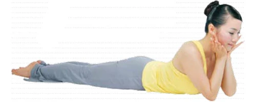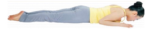 俯臥在墊子上,雙腿併攏伸直,腳背看地。彎曲手肘,雙手撐住胸部兩側的墊子,十指張開,指尖朝前.